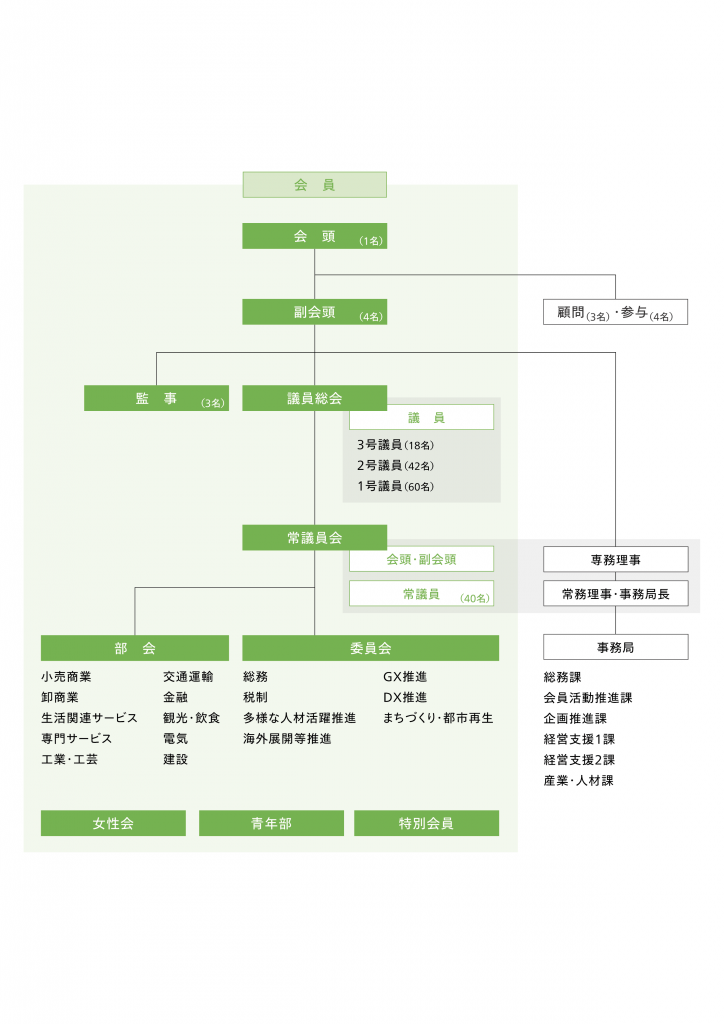 会員が業種ごとに所属し、日頃の商売で感じる意見や要望を発言したり、交流会、視察、講演会・セミナーなどを行っています。